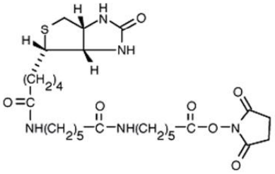 Biotin-XX, SE 在溫和條件下可以很容易地和一級(jí)或二級(jí)胺反應(yīng),常用來(lái)標(biāo)記蛋白。更長(zhǎng)的 XX 鏈有利于生物素與親和素或鏈霉素之間的相互作用。